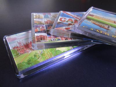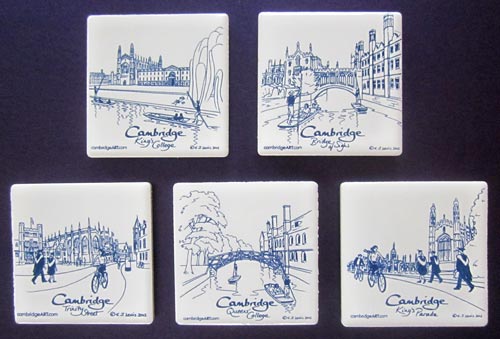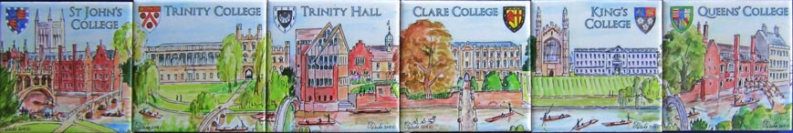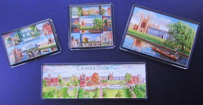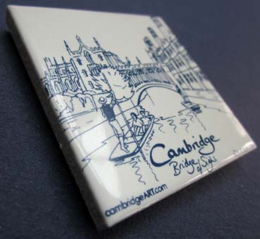 Ceramic Fridge MagnetsCeramic fridge magnets measure 6x6cm. The line drawing designs are dark blue on white and feature the following 5 views: the Backs at King's College, King's Parade, Queens' College, the Bridge of Sighs and Trinity Street. I can also get them in black and white for large orders. The colour designs feature six colleges along the Backs from a pen & watercolour painting, and fit together to form a panorama.Please email for more information if you would like to buy in bulk or wholesale. ![]() ![]()