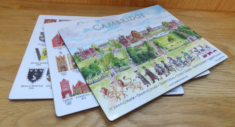 Cambridge Place MatsThese place mats measure approx 25x20cm and are 3mm thick. They are wooden (mdf) with a laminated shiny wipeable surface and are felted on the underside. They are currently unavailable. |