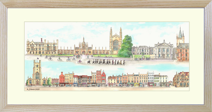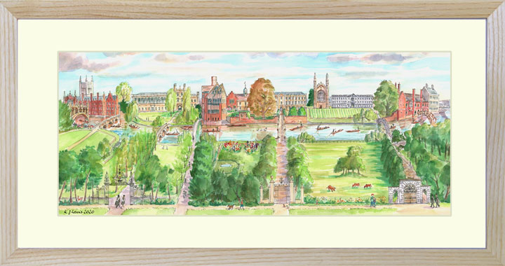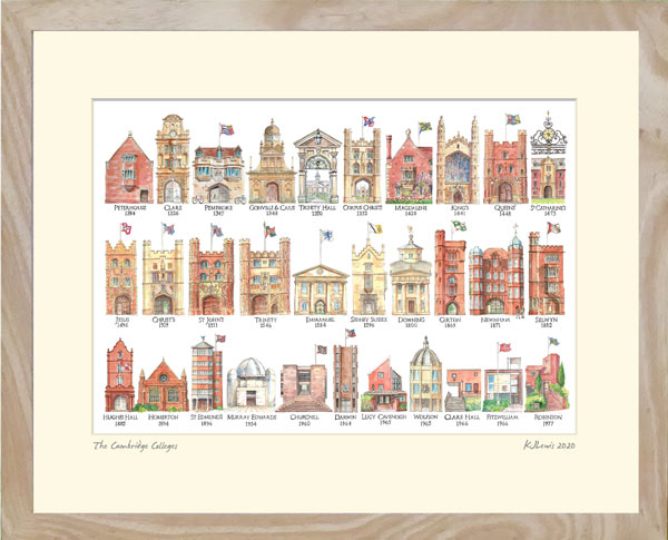 The 31 Cambridge CollegesThis signed print of all 31 colleges of the university is available in two sizes and for delivery to the UK only.Small: the mount is 40x30cm and the print is on A4 paper. Medium: the mount is 50x40cm and the print is on A3 paper. The frames are solid ash and measure about 2cm more than the mount. For more information on sizes see this page. |